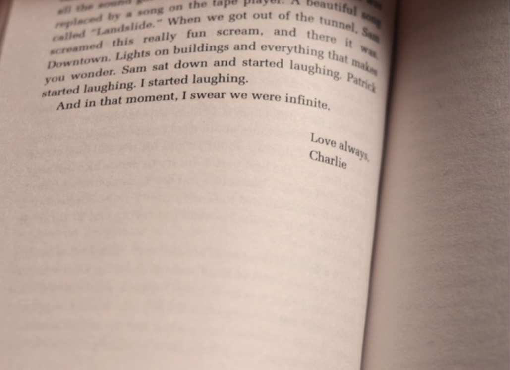 When freshman year started, I wasn't really friends with anyone. Just how Charlie had no one to sit with at the first football game, I had no one to sit with at lunch. Until a senior, Sean, talked to me. I sat with him and his friends at lunch, talked to him before and after school. We talked a lot about books, adventure, and writing. We especially talked about his favorite which is Catcher in the Rye. Just how Mr. Anderson gave books to Charlie to read, Sean recommended books to me that he thought were great. I even read Catcher in the Rye and Looking for Alaska. One day Sean said to me that he thinks I'm Charlie and he's Sam, in the friendship kind of way. Reading the beginning made me love it and I could relate to Charlie in some way. In the end, Sam leaves to a college that's far away but agrees with Charlie to stay in touch. To this day, despite the fact Sean goes to college in Iowa, I still keep in touch with Sean.