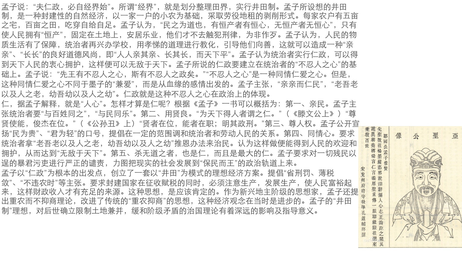 孟子说:夫仁政,必自经界始。所谓经界,就是划分整理田界,实行井田制。孟子所设想的井田制,是一种封建性的自然经济,以一家一户的小农为基础,采取劳役地租的剥削形式。每家农户有五亩之宅,百亩之田,吃穿自给自足。孟子认为,民之为道也,有恒产者有恒心,无恒产者无恒心,只有使人民拥有恒产,固定在土地上,安居乐业,他们才不去触犯刑律,为非作歹。孟子认为,人民的物质生活有了保障,统治者再兴办学校,用孝悌的道理进行教化,引导他们向善,这就可以造成一种亲亲长长的良好道德风尚,即人人亲其亲、长其长,而天下平。孟子认为统治者实行仁政,可以得到天下人民的衷心拥护,这样便可以无敌于天下。孟子所说的仁政要建立在统治者的不忍人之心的基础上。孟子说:先王有不忍人之心,斯有不忍人之政矣。”“不忍人之心是一种同情仁爱之心。但是,这种同情仁爱之心不同于墨子的兼爱,而是从血缘的感情出发的。孟子主张,亲亲而仁民老吾老以及人之老,幼吾幼以及人之幼。仁政就是这种不忍人之心在政治上的体现。