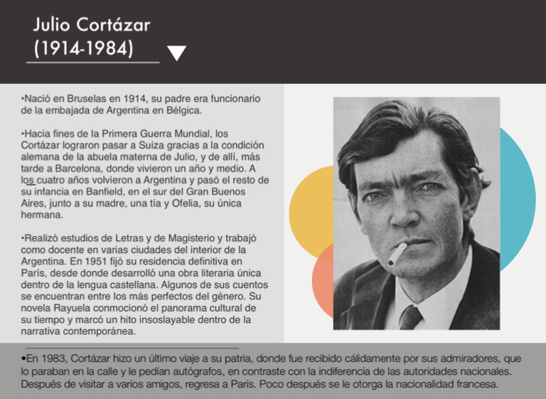 •Realizó estudios de Letras y de Magisterio y trabajó como docente en varias ciudades del interior de la Argentina. En 1951 fijó su residencia definitiva en París, desde donde desarrolló una obra literaria única dentro de la lengua castellana. Algunos de sus cuentos se encuentran entre los más perfectos del género. Su novela Rayuela conmocionó el panorama cultural de su tiempo y marcó un hito insoslayable dentro de la narrativa contemporánea.