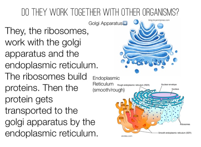 They, the ribosomes, work with the golgi apparatus and the endoplasmic reticulum. The ribosomes build proteins. Then the protein gets transported to the golgi apparatus by the endoplasmic reticulum.