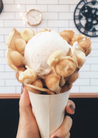 Egg puff waffles are a staple of the Hong Kong street scene. Adapted overseas by LimeRed and served with optional Ice Cream and other toppings make this a tasty treat.