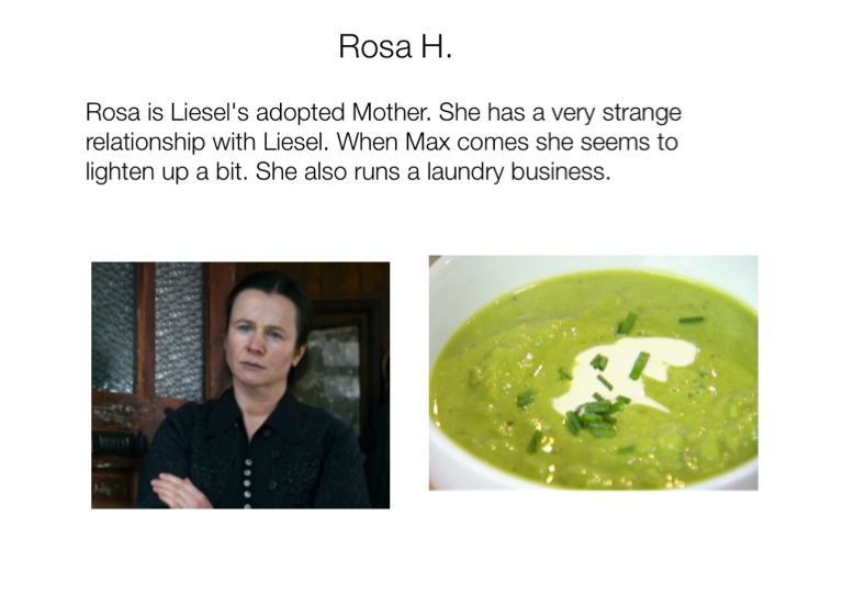 Rosa is Liesel's adopted Mother. She has a very strange relationship with Liesel. When Max comes she seems to lighten up a bit. She also runs a laundry business.