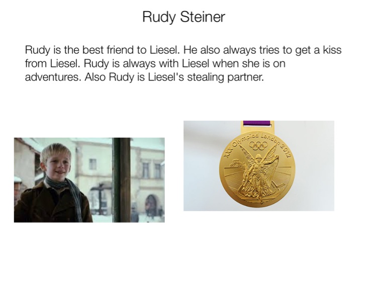 Rudy is the best friend to Liesel. He also always tries to get a kiss from Liesel. Rudy is always with Liesel when she is on adventures. Also Rudy is Liesel's stealing partner.