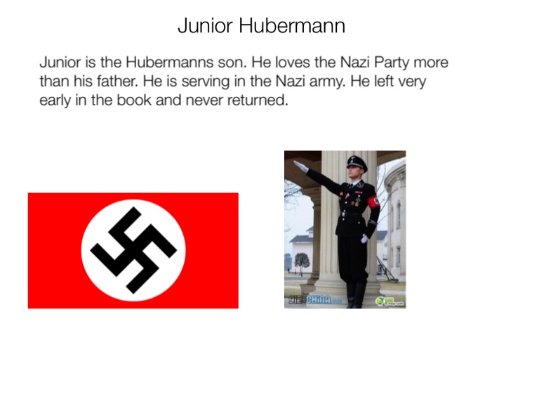 Junior is the Hubermanns son. He loves the Nazi Party more than his father. He is serving in the Nazi army. He left very early in the book and never returned.