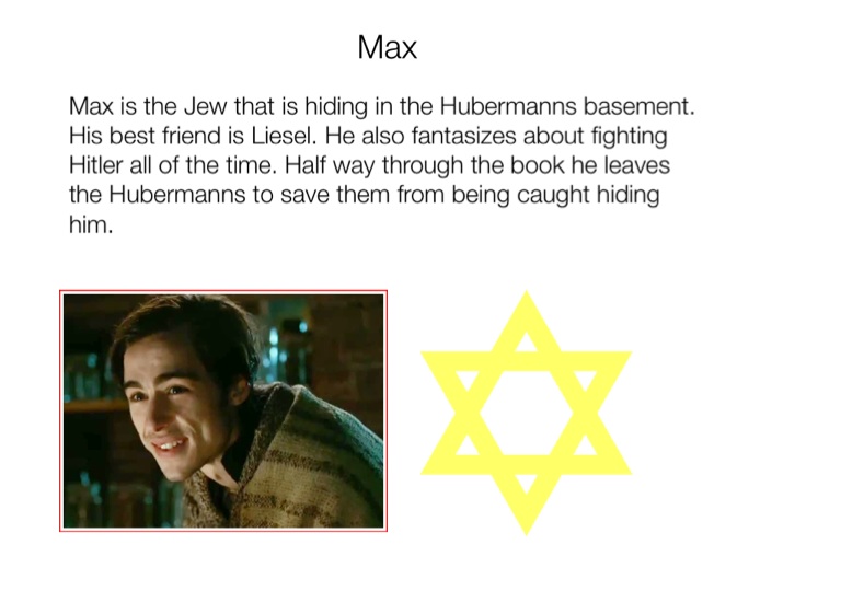 Max is the Jew that is hiding in the Hubermanns basement. His best friend is Liesel. He also fantasizes about fighting Hitler all of the time. Half way through the book he leaves the Hubermanns to save them from being caught hiding him.