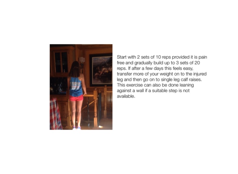 Start with 2 sets of 10 reps provided it is pain free and gradually build up to 3 sets of 20 reps. If after a few days this feels easy, transfer more of your weight on to the injured leg and then go on to single leg calf raises. This exercise can also be done leaning against a wall if a suitable step is not available.