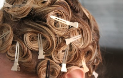 Set the right side of the head using a diagonal wave "S" shaping with the first row showing the flat curls on base. The 2nd row are the three types of stems. The 3rd row is to show volume pin curls on base. Form the curl by wrapping the hair into a circle and place the curl according to the mobility desired. The clip is placed so it points toward open end.