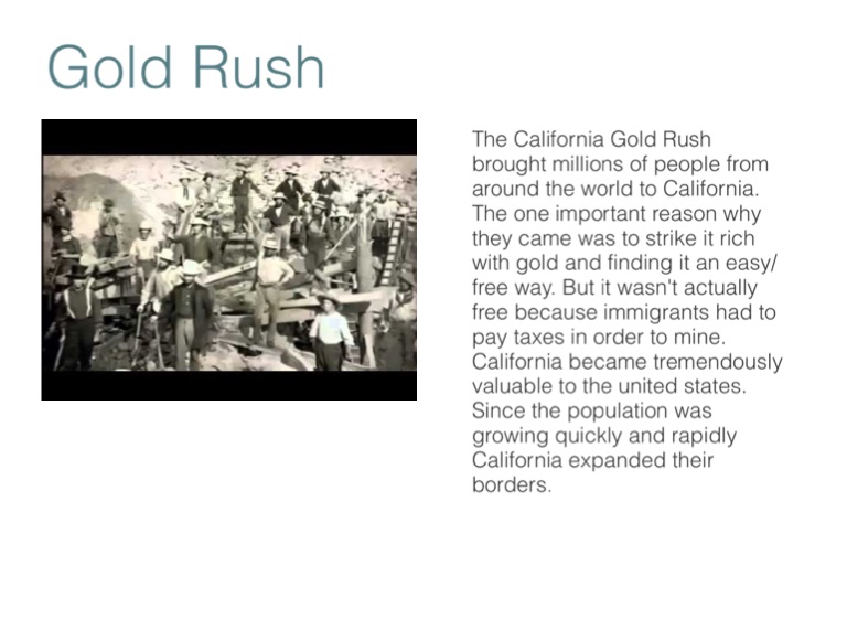 The California Gold Rush brought millions of people from around the world to California. The one important reason why they came was to strike it rich with gold and finding it an easy/free way. But it wasn't actually free because immigrants had to pay taxes in order to mine. California became tremendously valuable to the united states. Since the population was growing quickly and rapidly California expanded their borders.