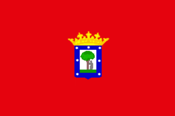 This flag is Madrid's flag, not the Spanish flag. The flag is crimson, a very dark shade of red, with the coat of arms in the center of the flag. Many people have done research on this flag and it turns out that the coat of arms is always one third the size of the flag.