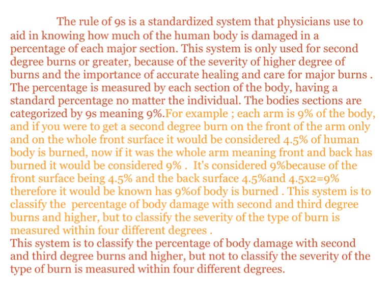 The rule of 9s is a standardized system that physicians use to aid in knowing how much of the human body is damaged in a percentage of each major section. This system is only used for second degree burns or greater, because of the severity of higher degree of burns and the importance of accurate healing and care for major burns . The percentage is measured by each section of the body, having a standard percentage no matter the individual. The bodies sections are categorized by 9s meaning 9%.For example ; each arm is 9% of the body, and if you were to get a second degree burn on the front of the arm only and on the whole front surface it would be considered 4.5% of human body is burned, now if it was the whole arm meaning front and back has burned it would be considered 9% . It's considered 9%because of the front surface being 4.5% and the back surface 4.5%and 4.5x2=9% therefore it would be known has 9%of body is burned . This system is to classify the percentage of body damage with second and third degree burns and higher, but to classify the severity of the type of burn is measured within four different degrees .