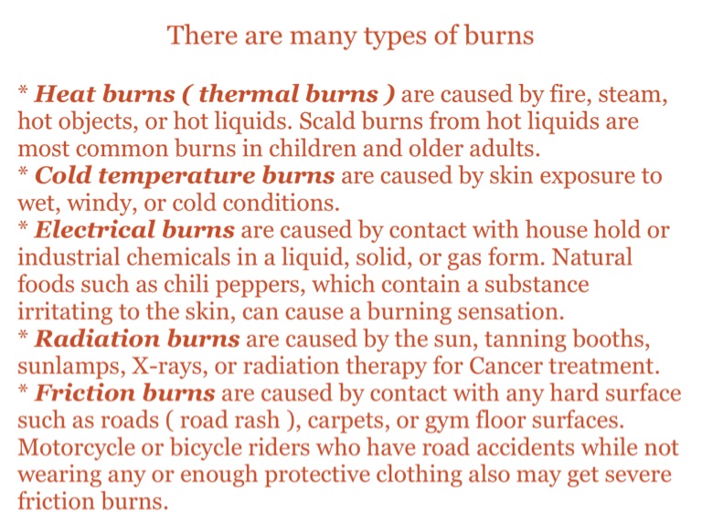 * Electrical burns are caused by contact with house hold or industrial chemicals in a liquid, solid, or gas form. Natural foods such as chili peppers, which contain a substance irritating to the skin, can cause a burning sensation.