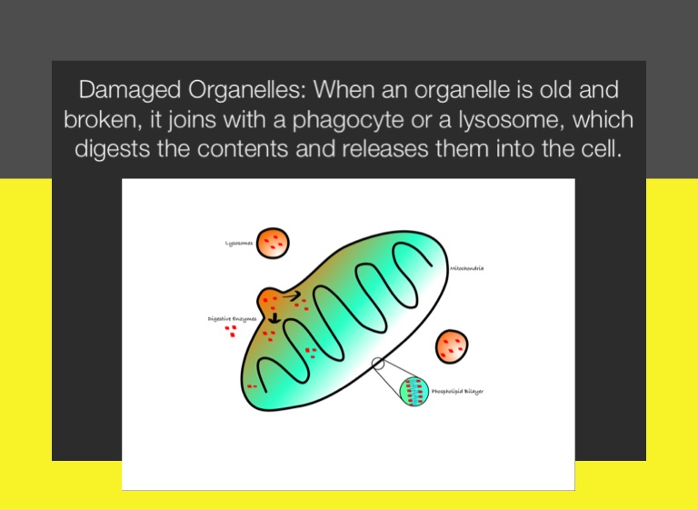 Damaged Organelles: When an organelle is old and broken, it joins with a phagocyte or a lysosome, which digests the contents and releases them into the cell.