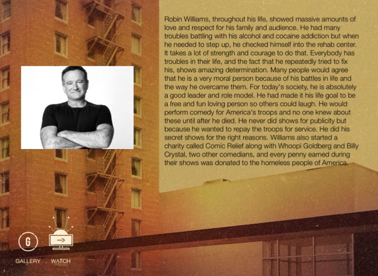 Robin Williams, throughout his life, showed massive amounts of love and respect for his family and audience. He had many troubles battling with his alcohol and cocaine addiction but when he needed to step up, he checked himself into the rehab center. It takes a lot of strength and courage to do that. Everybody has troubles in their life, and the fact that he repeatedly tried to fix his, shows amazing determination. Many people would agree that he is a very moral person because of his battles in life and the way he overcame them. For today's society, he is absolutely a good leader and role model. He had made it his life goal to be a free and fun loving person so others could laugh. He would perform comedy for America's troops and no one knew about these until after he died. He never did shows for publicity but because he wanted to repay the troops for service. He did his secret shows for the right reasons. Williams also started a charity called Comic Relief along with Whoopi Goldberg and Billy Crystal, two other comedians, and every penny earned during their shows was donated to the homeless people of America.