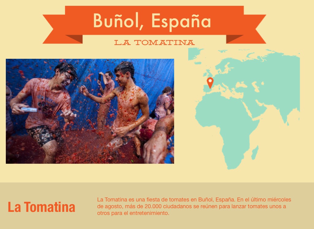 La Tomatina es una fiesta de tomates en Buñol, España. En el último miércoles de agosto, más de 20.000 ciudadanos se reúnen para lanzar tomates unos a otros para el entretenimiento.