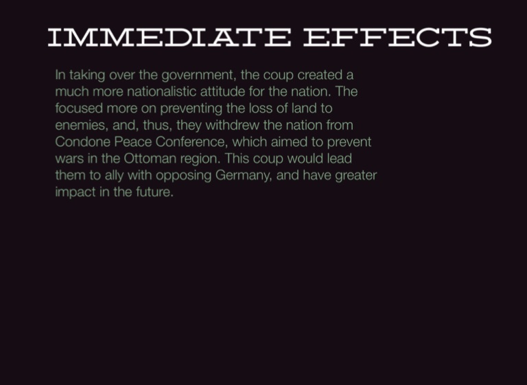 In taking over the government, the coup created a much more nationalistic attitude for the nation. The focused more on preventing the loss of land to enemies, and, thus, they withdrew the nation from Condone Peace Conference, which aimed to prevent wars in the Ottoman region. This coup would lead them to ally with opposing Germany, and have greater impact in the future.
