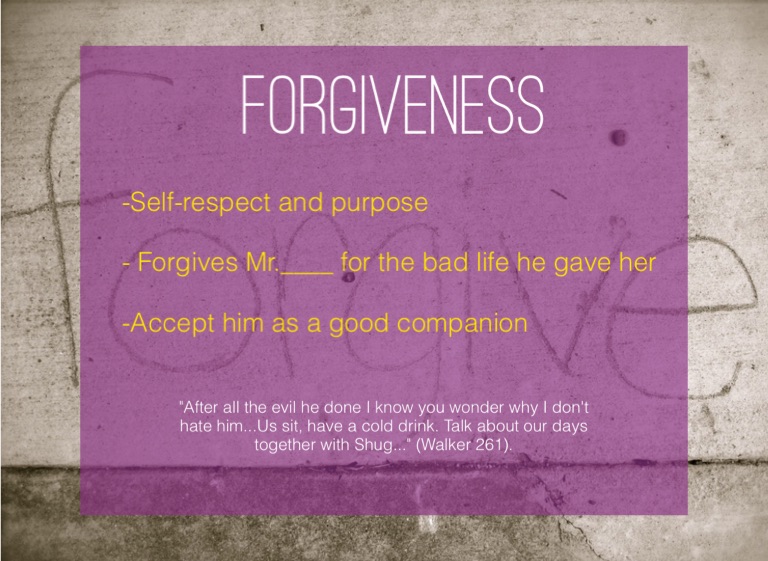 "After all the evil he done I know you wonder why I don't hate him...Us sit, have a cold drink. Talk about our days together with Shug..." (Walker 261).