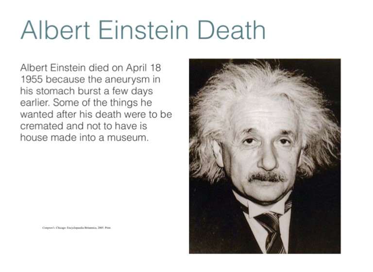 Albert Einstein died on April 18 1955 because the aneurysm in his stomach burst a few days earlier. Some of the things he wanted after his death were to be cremated and not to have is house made into a museum.
