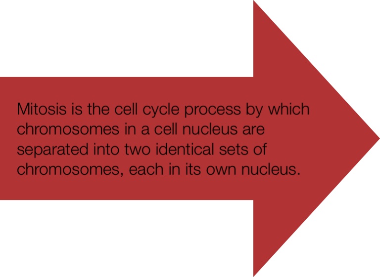 Mitosis is the cell cycle process by which chromosomes in a cell nucleus are separated into two identical sets of chromosomes, each in its own nucleus.