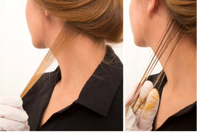 - apply formula that you are using to a small hidden piece of hair (usually within the back, bottom section)