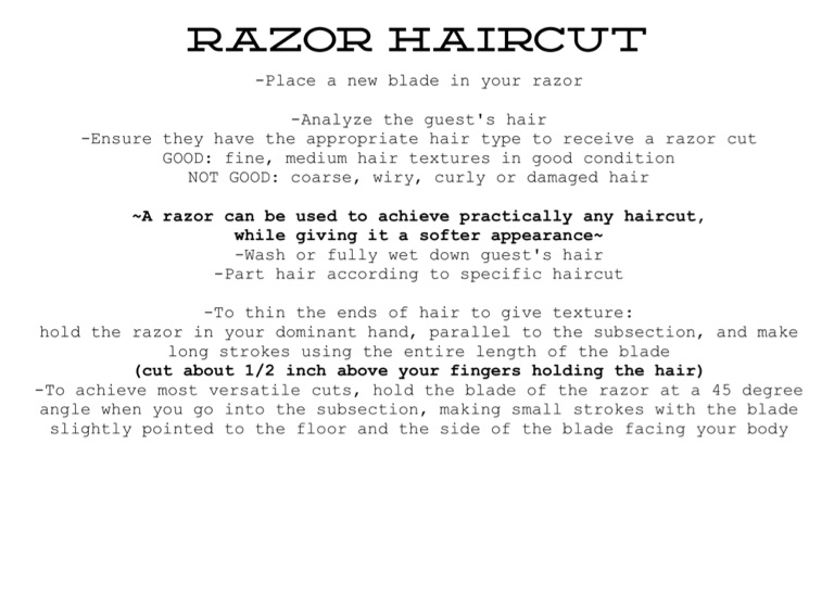 -To achieve most versatile cuts, hold the blade of the razor at a 45 degree angle when you go into the subsection, making small strokes with the blade slightly pointed to the floor and the side of the blade facing your body