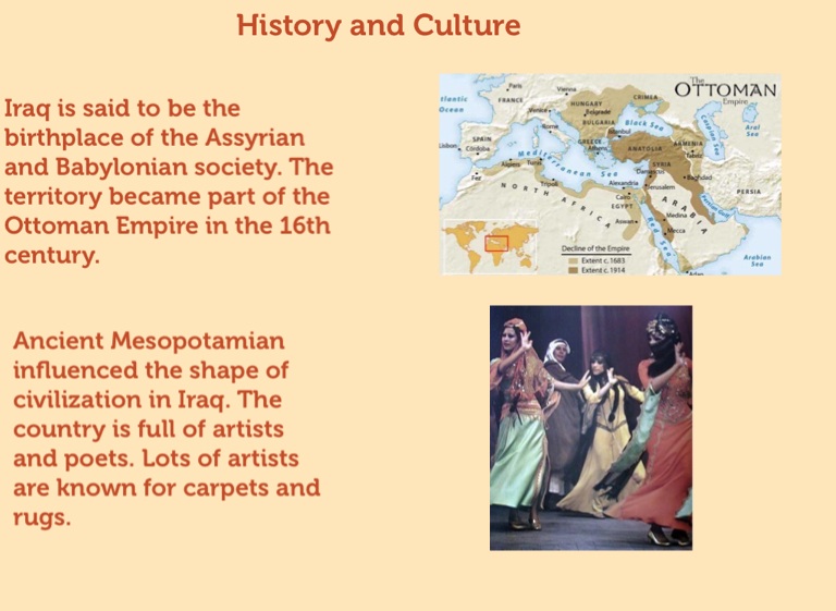 Ancient Mesopotamian influenced the shape of civilization in Iraq. The country is full of artists and poets. Lots of artists are known for carpets and rugs.