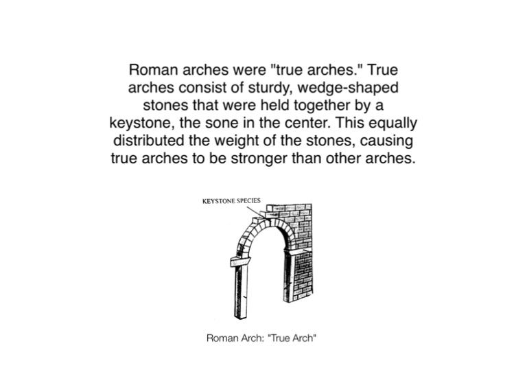 Roman arches were "true arches." True arches consist of sturdy, wedge-shaped stones that were held together by a keystone, the sone in the center. This equally distributed the weight of the stones, causing true arches to be stronger than other arches.