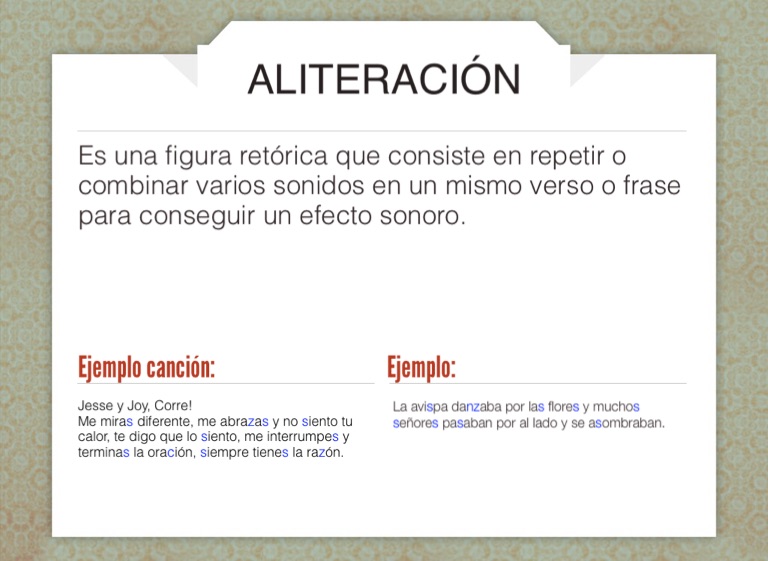 Es una figura retórica que consiste en repetir o combinar varios sonidos en un mismo verso o frase para conseguir un efecto sonoro.