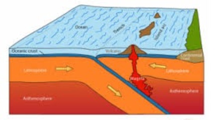 Oceanic to oceanic convergent plate boundaries are two oceanic plates crashing into each other. A trench is formed in the ocean floor. Oceanic and oceanic plate convergent collisions form a chain of volcanos. The crust that is pulled under melts to form magma. This magma rises to the top of the other oceanic plate and erupts on the ocean floor.