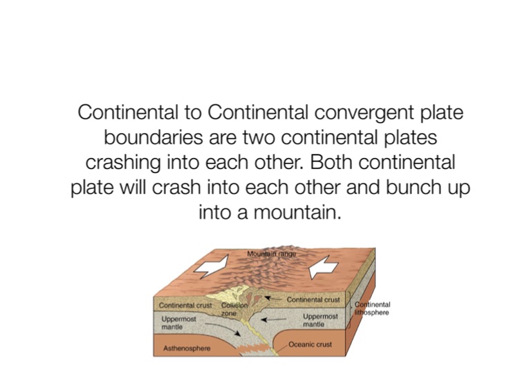 Continental to Continental convergent plate boundaries are two continental plates crashing into each other. Both continental plate will crash into each other and bunch up into a mountain.