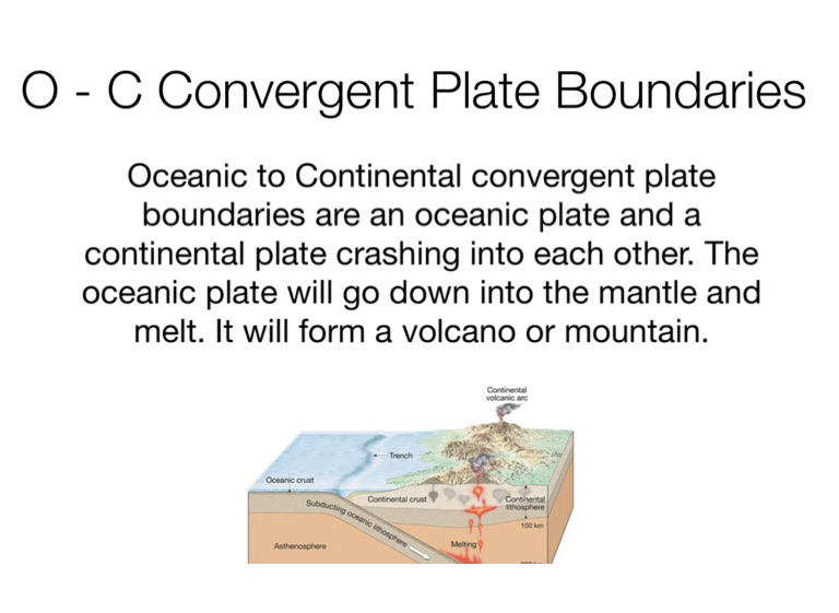 Oceanic to Continental convergent plate boundaries are an oceanic plate and a continental plate crashing into each other. The oceanic plate will go down into the mantle and melt. It will form a volcano or mountain.