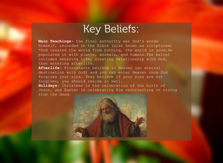 Afterlife: Protestants believe in Heaven (an eternal destination with God) and you can enter Heaven once God forgives your sins. They believe if your sins are not forgiven, you should reside in Hell.