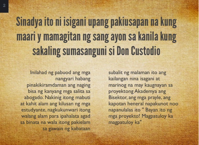 Sinadya ito ni isigani upang pakiusapan na kung maari y mamagitan ng sang ayon sa kanila kung sakaling sumasanguni si Don Custodio