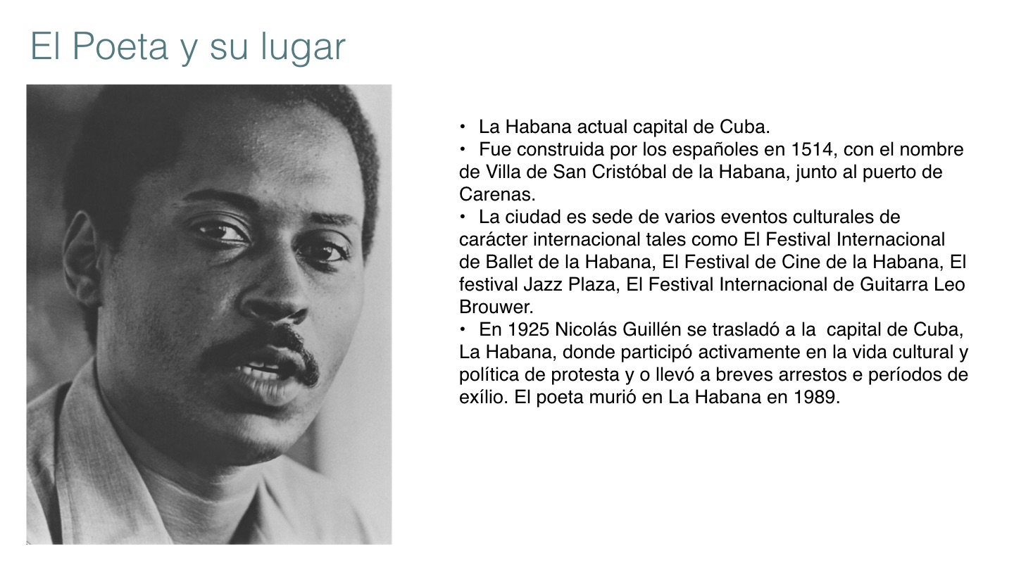 • En 1925 Nicolás Guillén se trasladó a la capital de Cuba, La Habana, donde participó activamente en la vida cultural y política de protesta y o llevó a breves arrestos e períodos de exílio. El poeta murió en La Habana en 1989.