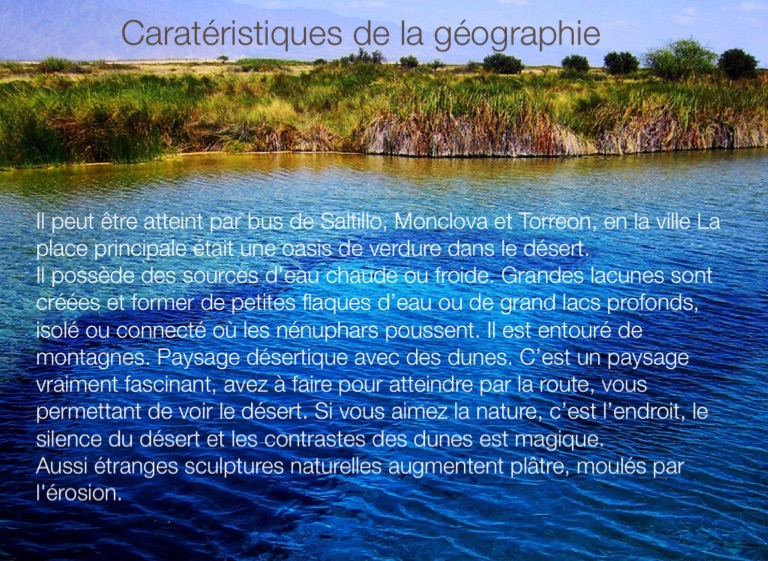 Il possède des sources d'eau chaude ou froide. Grandes lacunes sont créées et former de petites flaques d’eau ou de grand lacs profonds, isolé ou connecté où les nénuphars poussent. Il est entouré de montagnes. Paysage désertique avec des dunes. C’est un paysage vraiment fascinant, avez à faire pour atteindre par la route, vous permettant de voir le désert. Si vous aimez la nature, c’est l’endroit, le silence du désert et les contrastes des dunes est magique.