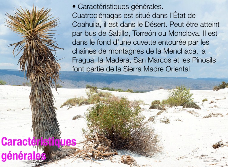 Cuatrociénagas est situé dans l'État de Coahuila, il est dans le Désert. Peut être atteint par bus de Saltillo, Torreón ou Monclova. Il est dans le fond d’une cuvette entourée par les chaînes de montagnes de la Menchaca, la Fragua, la Madera, San Marcos et les Pinosils font partie de la Sierra Madre Oriental.