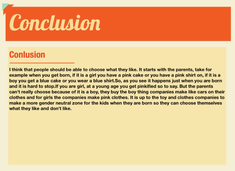 I think that people should be able to choose what they like. It starts with the parents, take for example when you get born, if it is a girl you have a pink cake or you have a pink shirt on, if it is a boy you get a blue cake or you wear a blue shirt.So, as you see it happens just when you are born and it is hard to stop.If you are girl, at a young age you get pinkified so to say. But the parents can't really choose because of it is a boy, they buy the boy thing companies make like cars on their clothes and for girls the companies make pink clothes. It is up to the toy and clothes companies to make a more gender neutral zone for the kids when they are born so they can choose themselves what they like and don't like.