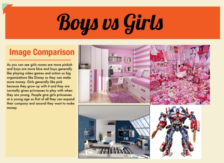 As you can see girls rooms are more pinkish and boys are more blue and boys generally like playing video games and action so big organizations like Disney so they can make more money. Girls generally like pink because they grow up with it and they are normally given princesses to play with when they are young. People give girls princesses at a young age so first of all they can expand their company and second they want to make money.