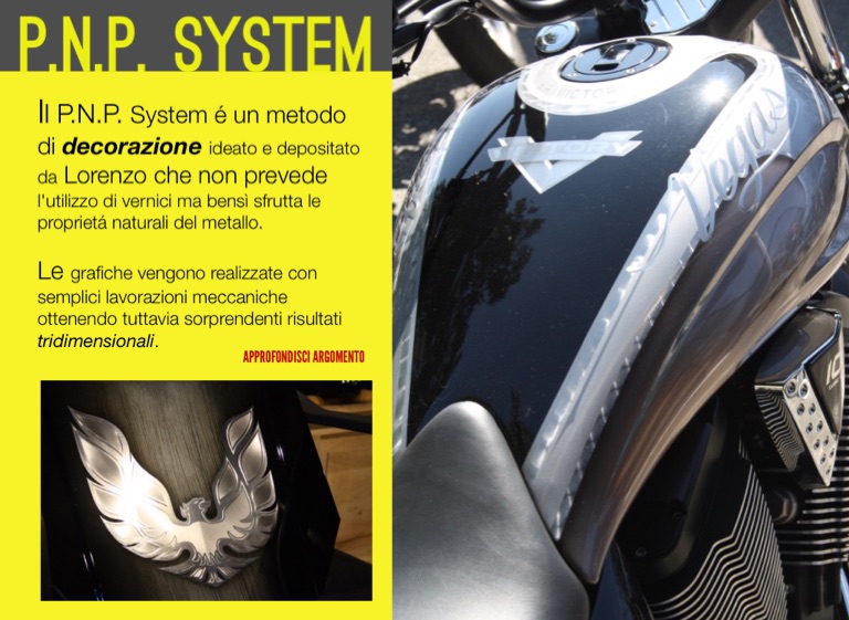 Il P.N.P. System é un metodo di decorazione ideato e depositato da Lorenzo che non prevede l'utilizzo di vernici ma bensì sfrutta le proprietá naturali del metallo.