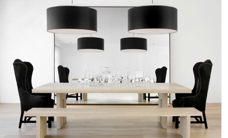 En el comedor hay las lamparas es color negro. Yo pongo la mesa. Las sillas es color negro. Hay el espejo detras de la mesa.