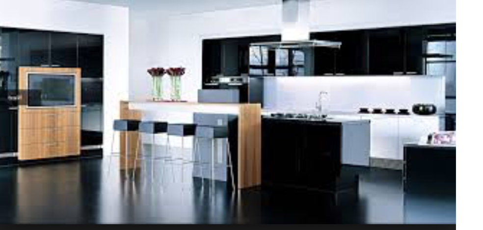 En la cocina hay el los platos y las sillas. Es color de la cocina es negro y blanco. Los flores encima de la mesa.