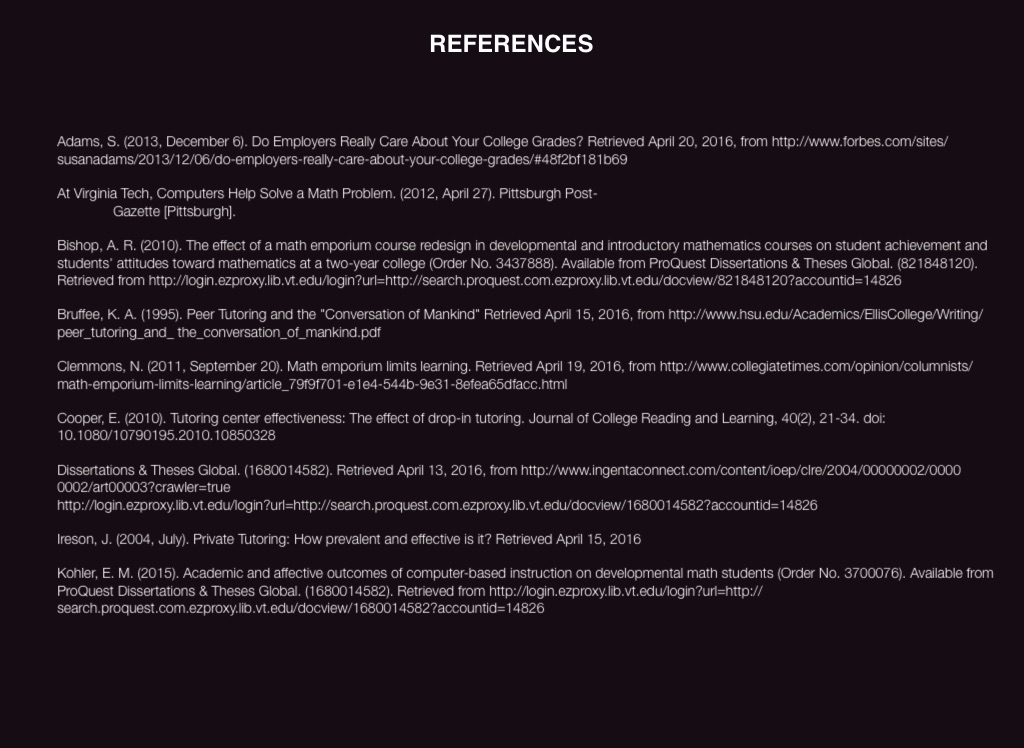Kohler, E. M. (2015). Academic and affective outcomes of computer-based instruction on developmental math students (Order No. 3700076). Available from ProQuest Dissertations & Theses Global. (1680014582). Retrieved from http://login.ezproxy.lib.vt.edu/login?url=http://search.proquest.com.ezproxy.lib.vt.edu/docview/1680014582?accountid=14826