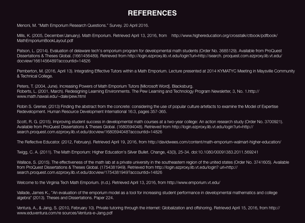 Peters, T. (2004, June). Increasing Powers of Math Emporium Tutors [Microsoft Word]. Blacksburg.