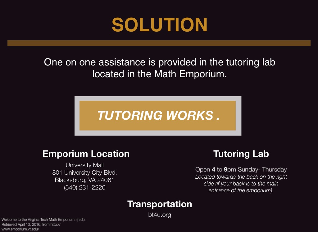 Welcome to the Virginia Tech Math Emporium. (n.d.). Retrieved April 13, 2016, from http://www.emporium.vt.edu/