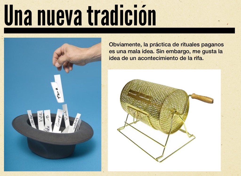 Obviamente, la práctica de rituales paganos es una mala idea. Sin embargo, me gusta la idea de un acontecimiento de la rifa.
