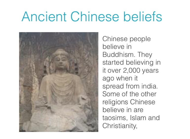 Chinese people believe in Buddhism. They started believing in it over 2,000 years ago when it spread from india. Some of the other religions Chinese believe in are taosims, Islam and Christianity,
