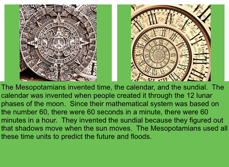 The Mesopotamians invented time, the calendar, and the sundial. The calendar was invented when people created it through the 12 lunar phases of the moon. Since their mathematical system was based on the number 60, there were 60 seconds in a minute, there were 60 minutes in a hour. They invented the sundial because they figured out that shadows move when the sun moves. The Mesopotamians used all these time units to predict the future and floods.
