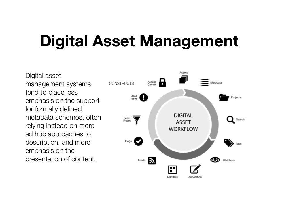 Digital asset management systems tend to place less emphasis on the support for formally defined metadata schemes, often relying instead on more ad hoc approaches to description, and more emphasis on the presentation of content.