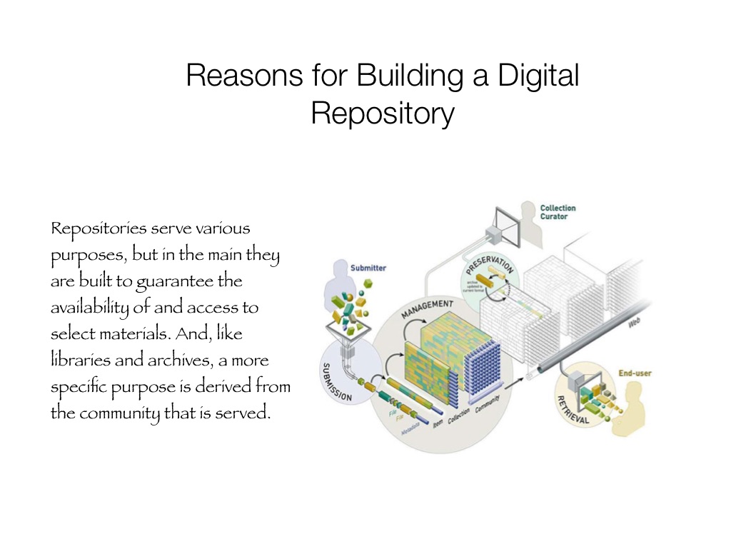 Repositories serve various purposes, but in the main they are built to guarantee the availability of and access to select materials. And, like libraries and archives, a more specific purpose is derived from the community that is served.