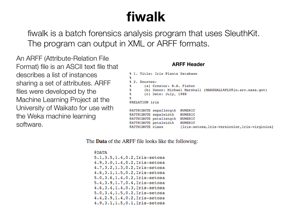 fiwalk is a batch forensics analysis program that uses SleuthKit. The program can output in XML or ARFF formats.