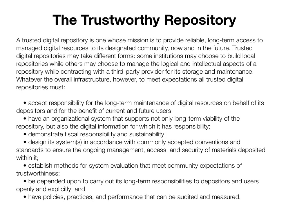 A trusted digital repository is one whose mission is to provide reliable, long-term access to managed digital resources to its designated community, now and in the future. Trusted digital repositories may take different forms: some institutions may choose to build local repositories while others may choose to manage the logical and intellectual aspects of a repository while contracting with a third-party provider for its storage and maintenance. Whatever the overall infrastructure, however, to meet expectations all trusted digital repositories must: